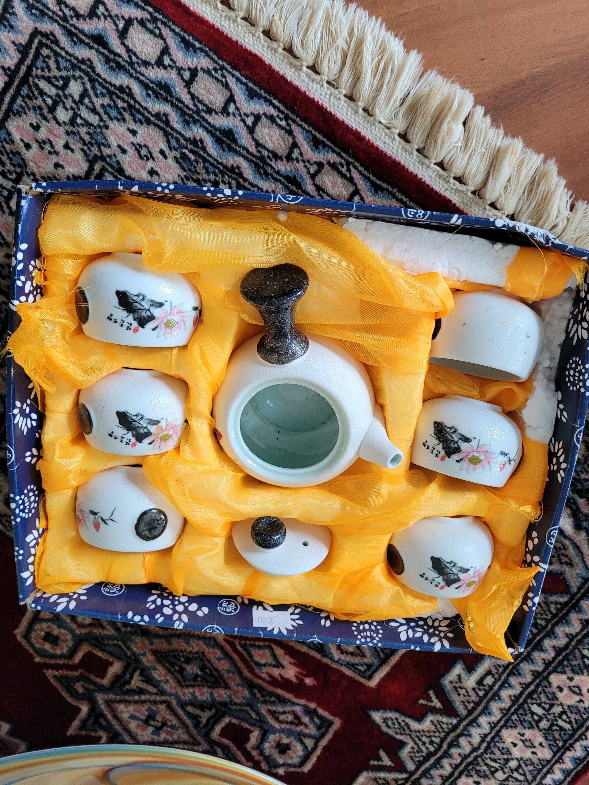 Chinees Kung Fu Theeservies in wit beschilderd porselein.