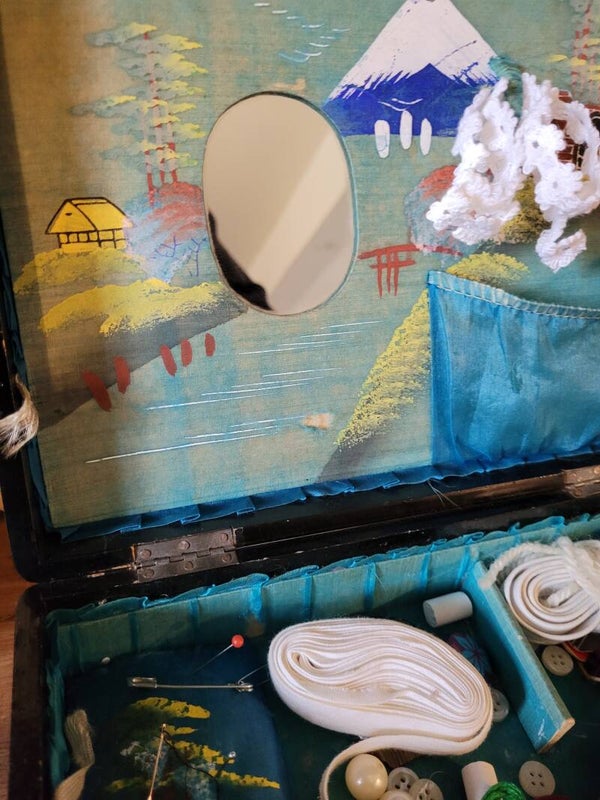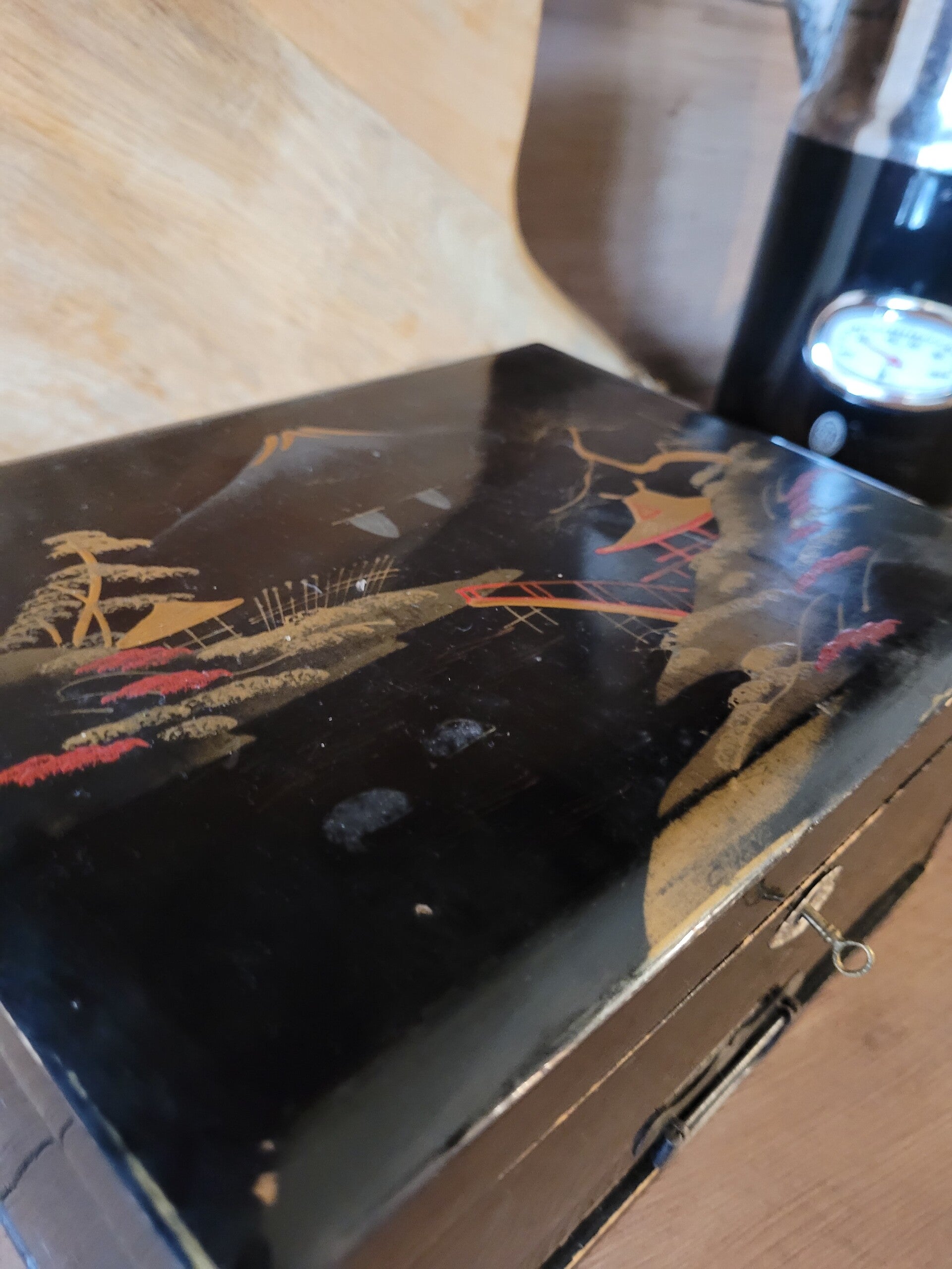 Prachtige zeer oude Naaidoos van Japans lakwerk handbeschilderd.
