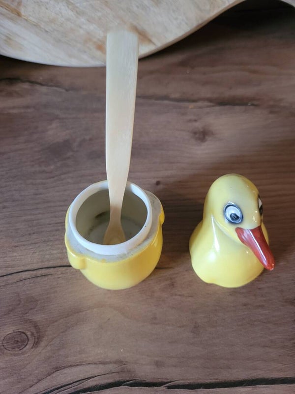 prachtig mooi mosterd potje in vorm van een eend in prima conditie.