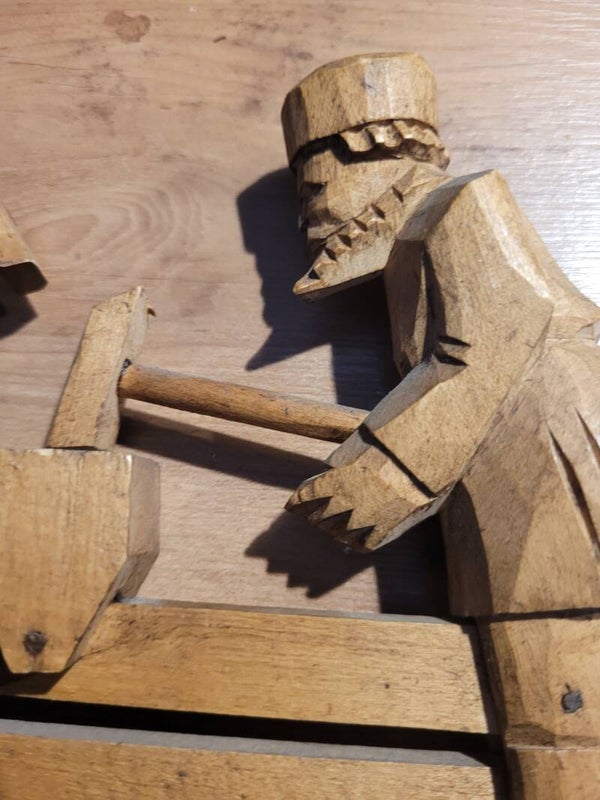 Zeer mooi handgesneden houten beer en kozak die wanneer je de schuifjes beweegd om en om de hamer op het blok laten vallen.
